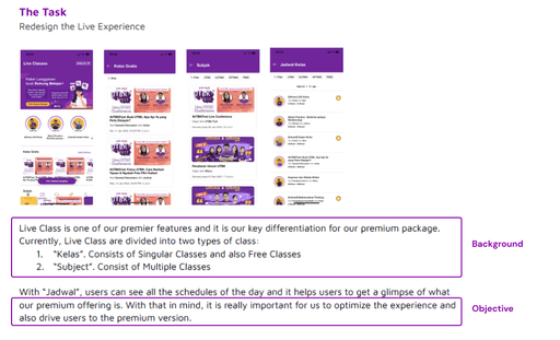 In the brief, the background and objective are pretty clear although it’s not stated explicitly. The brief highlights the objective of the project by saying “with that in mind”. Based on this brief, it is clear that the goal is to increase the conversion rate from Live Class.